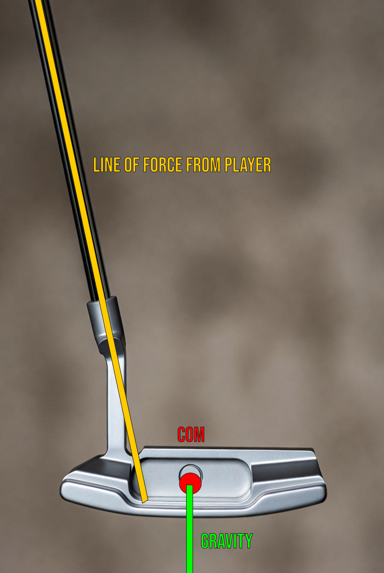 In a heel-shafted putter, this twisting is unavoidable. Like mentioned above, gravity will create torque about the shaft axis that our hands must fight. When making a putting stroke, the line of force is through the shaft which produces no torque about the shaft axis. Great, except now there is torque about the COM axis, and the putter face is no longer square! Now our hands must fight that torque to keep the face square. This is why traditional putters feel like they are working against the player.